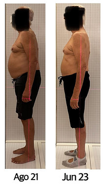 Na foto observa-se evolução significativa na postura de uma paciente proporcionada pela ativação muscular orientada pelo terapeuta, que gerou aprendizado sobre o controle motor e reorientação postural.